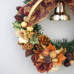 クリスマスリース20cmブラウン 玄関 部屋 北欧 ナチュラル 手作り 上品 高級 豪華 おしゃれ ワイン ゴールド 金 飾り 装飾 かわいい ドア 壁掛け ハンガー アートフラワー デコレーション 天然素材 花 造花 ローズ リボン ベル インテリア プレゼント 国内生産 母の日