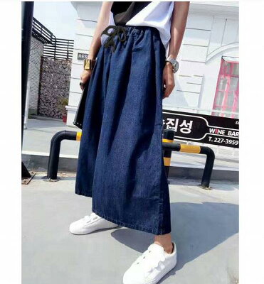 デニムガウチョパンツ ロングパンツ ブルー ワンサイズウエストゴム フリーサイズエレガンス 大人 女子会 ほっそり効果大送料無料