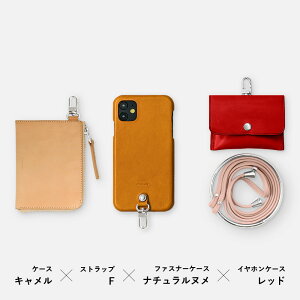 おでかけ便利な4点のセット商品スマホケース、ファスナーケース、イヤホンケース、リング付きショルダーストラップのお好みの色を見つけて、コーディネートを楽しんで頂けます。