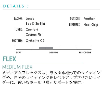 FLEX ・1 / 5段階(1柔〜5硬) コメント サロモンが開発したFit To Rideを採用し、箱から出してすぐに使える快適な履き心地を実現した、チームのお気に入りパークブーツです。