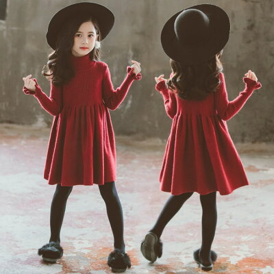 【予約品】【2019年新作】女の子 レッド 毛糸 ワンピース フリル 長袖 タイト タートルネック ハイネック アクリル 赤 秋 冬 可愛い お洒落 子供服 キッズ ジュニア【110-160】韓国子供服