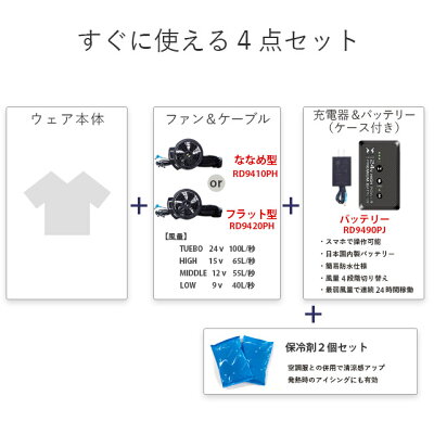 御注文を頂戴しました商品の梱包時にはマスク、手袋、フェイスシールドの着用の徹底事務所、倉庫内のソーシャルディスタンスの徹底1時間に1回の換気、空気の入れ替え商品ピッキング時のマスク、手袋、フェイスシールドの着用の徹底1梱包毎のアルコール除菌消毒の実施配送会社様、配送ドライバー様への配送時のマスクの徹底を要請3密を避ける様な1フロアあたりの人員の分散通勤ラッシュを避けての時差出勤、時短営業の継続毎週水曜日のノー残業の実施毎週水曜日のノー残業の実施ファン付ウェアセット内容:空調風神服 ウェア本体、日本製リチウムイオンバッテリーセット(RD9490PJ)、ななめ型orフラット型ハイパワーファン2個・ファン用ケーブル、大型200g保冷剤2個セット